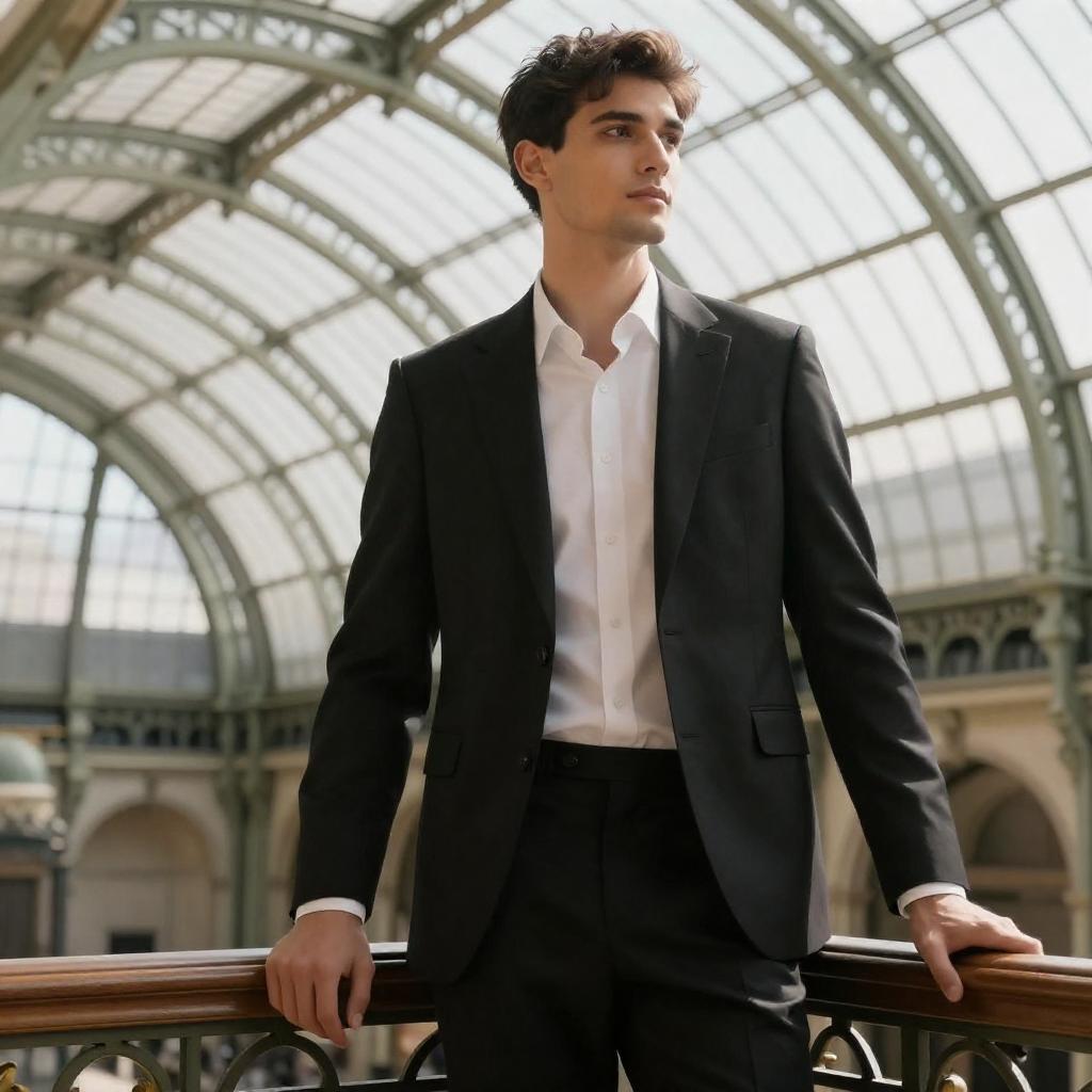 Young man with loose curly hair wearing a dark velvet smoking jacket and a silk ascot tie, standing in a luxurious hotel bar. The setting features warm chandelier lighting and elegant interior decor, captured in a fashion editorial style with soft fill light and subtle film grain.