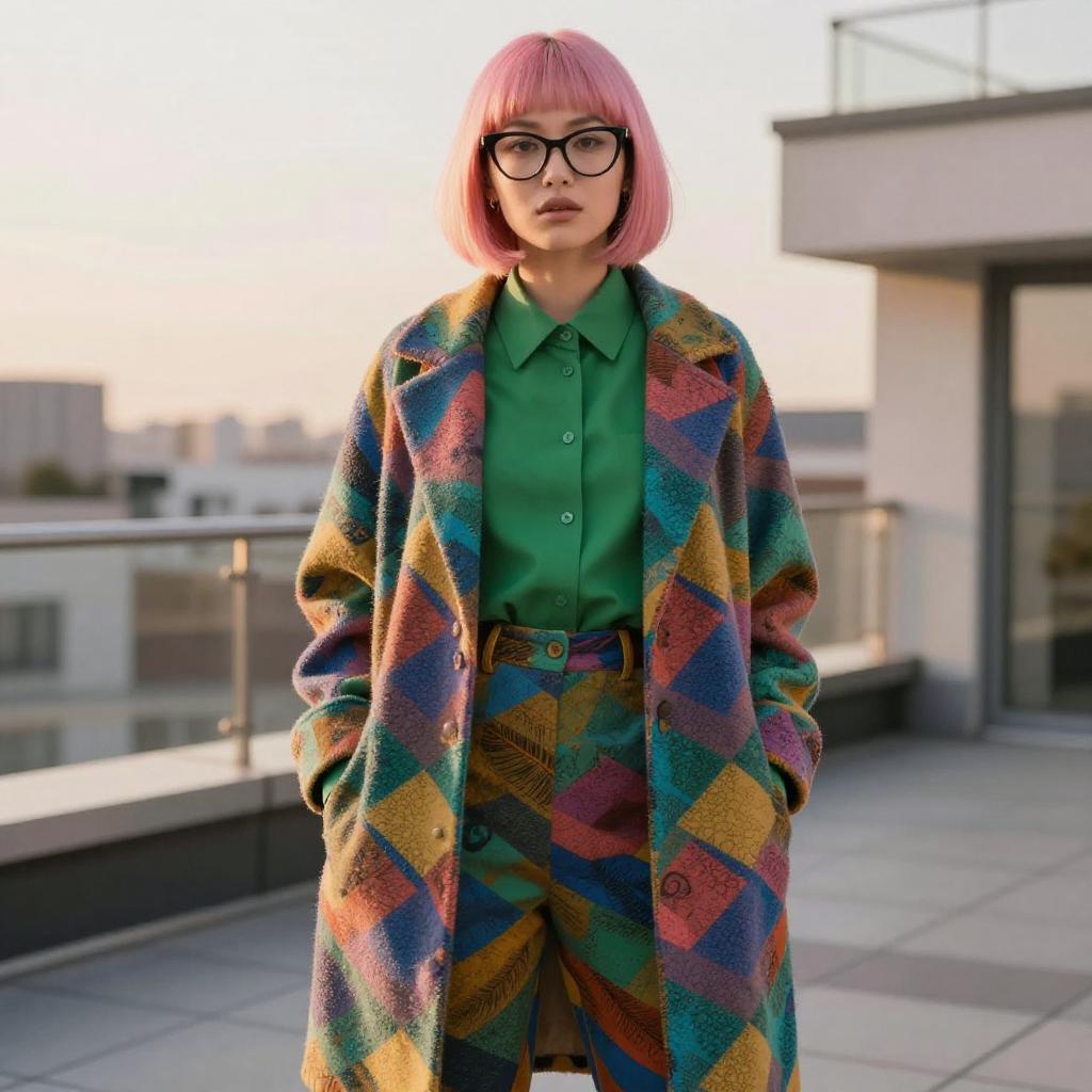 Portrait of a stylish young woman with a pink bob haircut wearing vintage cat-eye glasses and a vibrant multicolored patterned coat over a green blouse and matching pants. The photo is taken outdoors at sunset on a modern rooftop terrace with soft, warm lighting.