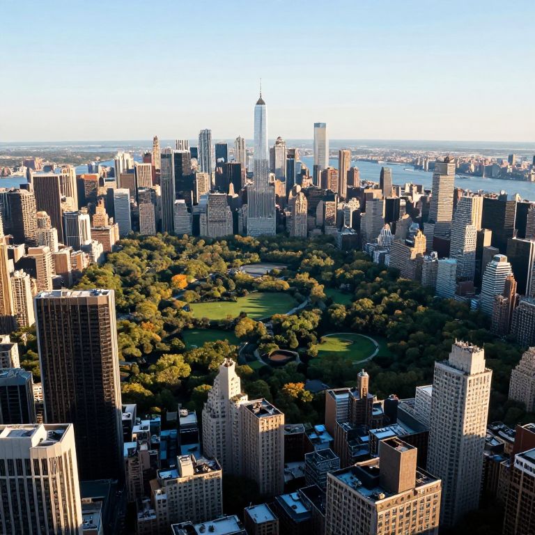 Aerial photograph of a vibrant cityscape featuring a dense cluster of tall, modern skyscrapers with varying shades of gray and white. At the center, a lush, green park with winding paths and patches of trees contrasts with the urban environment. The tallest building, with a distinct spire, is centrally located. The background reveals a wide river and distant shoreline under a clear, bright blue sky. Shadows cast by the buildings add depth and dimension to the scene. The overall composition highlights the juxtaposition of nature and urban architecture in a bustling metropolitan area.