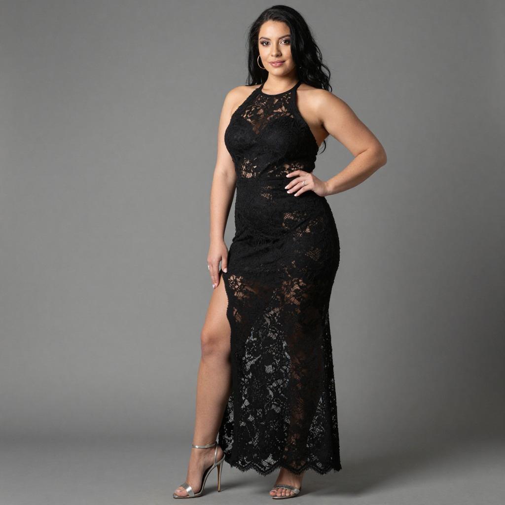 Photograph of a curvy woman with long black hair, wearing a sleeveless black lace halter gown with a high slit, revealing her left leg. She stands against a ured gray wall, wearing silver high-heeled sandals. Her right hand rests on her hip, and her left arm is slightly bent.