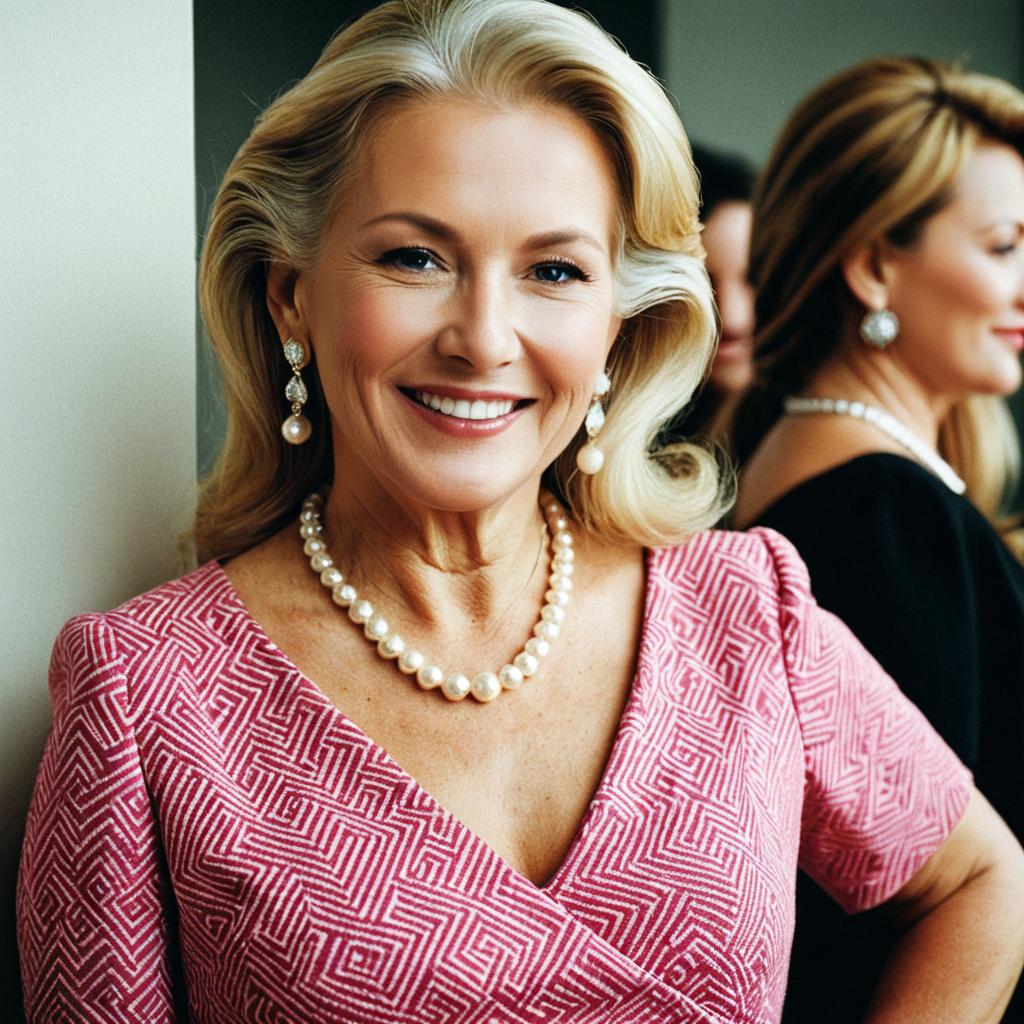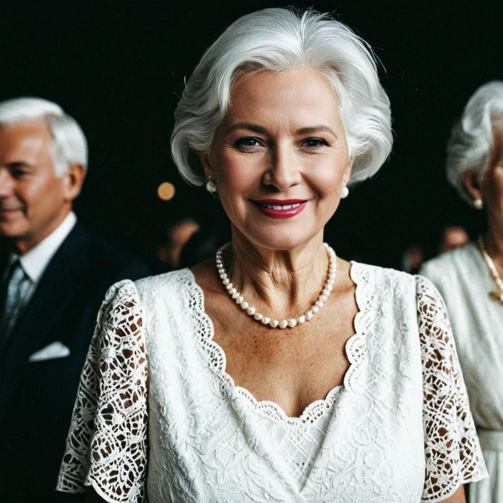 Photorealistic portrait of an elegant older woman with white hair wearing a white lace dress and pearl necklace. She has short hair, red lipstick, and is smiling while looking directly at the camera. Two other older individuals are blurred in the background, one woman and one man dressed formally.