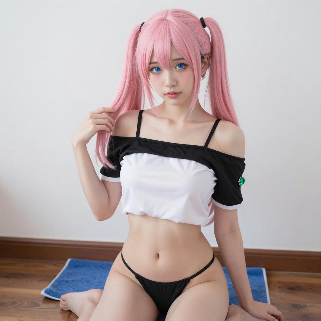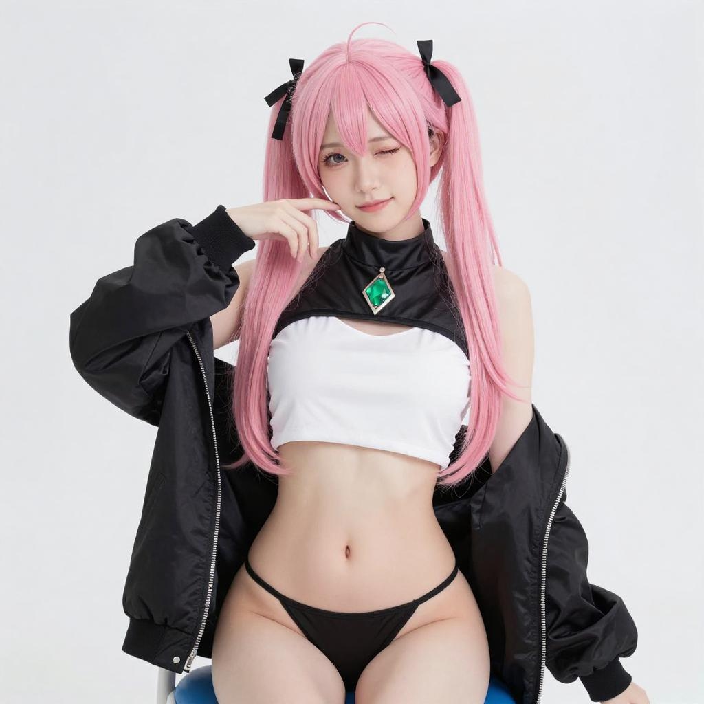 Photograph of a cosplayer with long pink twin-tails, wearing a black and white cropped top, black thong, and thigh-high pink socks. She is kneeling on a blue chair, looking over her shoulder with a seductive expression. Her large, round buttocks are prominently displayed. The background is plain white.