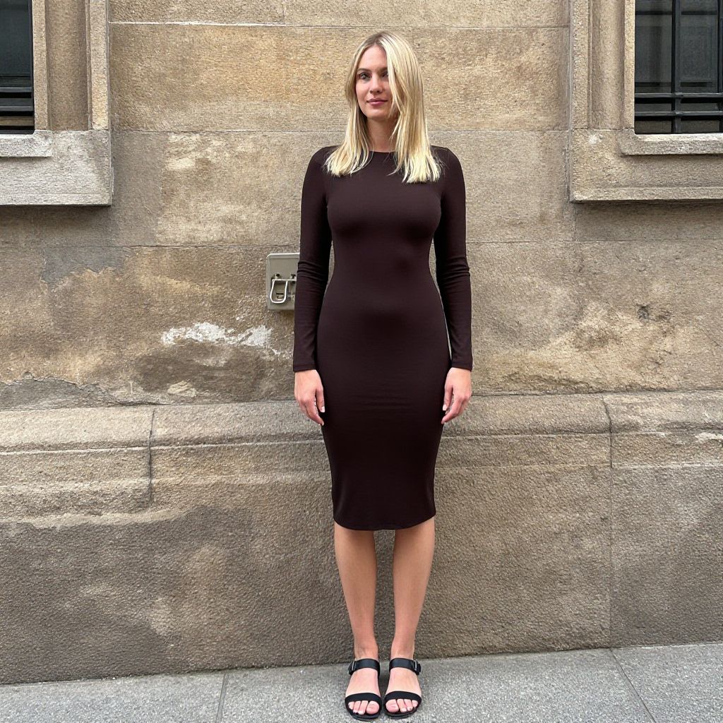 Photograph of a blonde woman standing against a weathered stone building. She's wearing a form-fitting, long-sleeve, dark brown dress that reaches just below her knees, paired with black open-toe sandals. Her hair is straight and falls past her shoulders. The stone wall behind her has a textured, aged look with visible grout lines and a small electrical box. She's standing on a grey sidewalk.