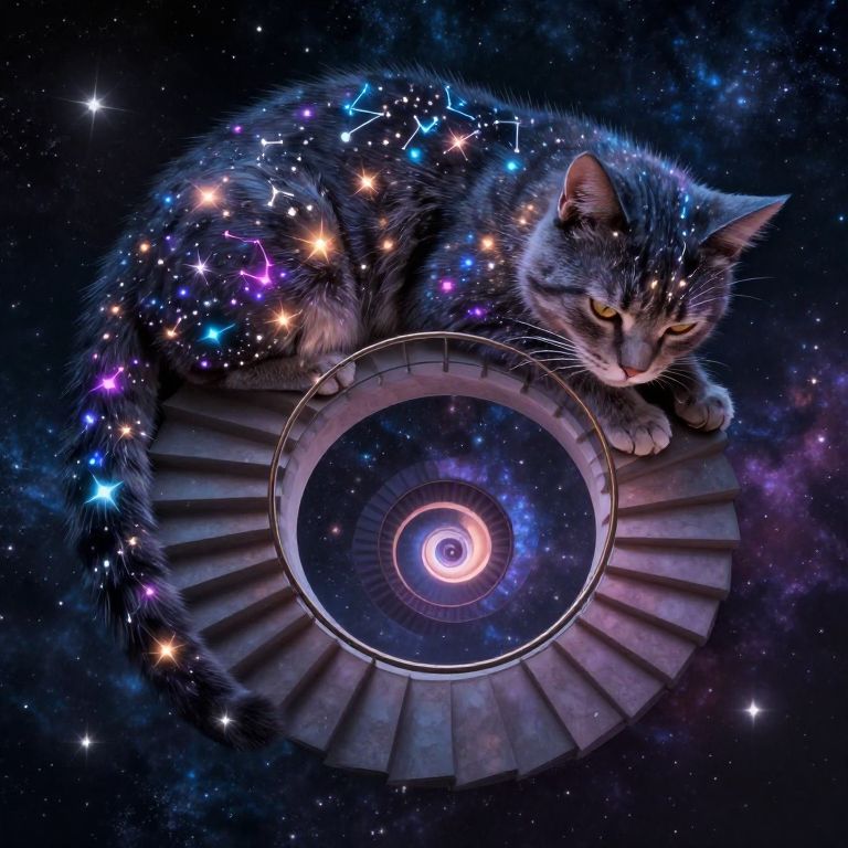 Infinite wonder unfolds as a Möbius staircase spirals eternally within the cosmic embrace of a colossal, slumbering cat, its fur aglow with shifting constellations that hum with the rhythm of the universe, inviting contemplation of the boundless and the eternal.