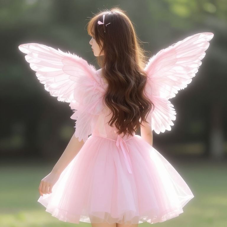 Girl with long brown hair wearing a pink fairy dress with wings on her back.