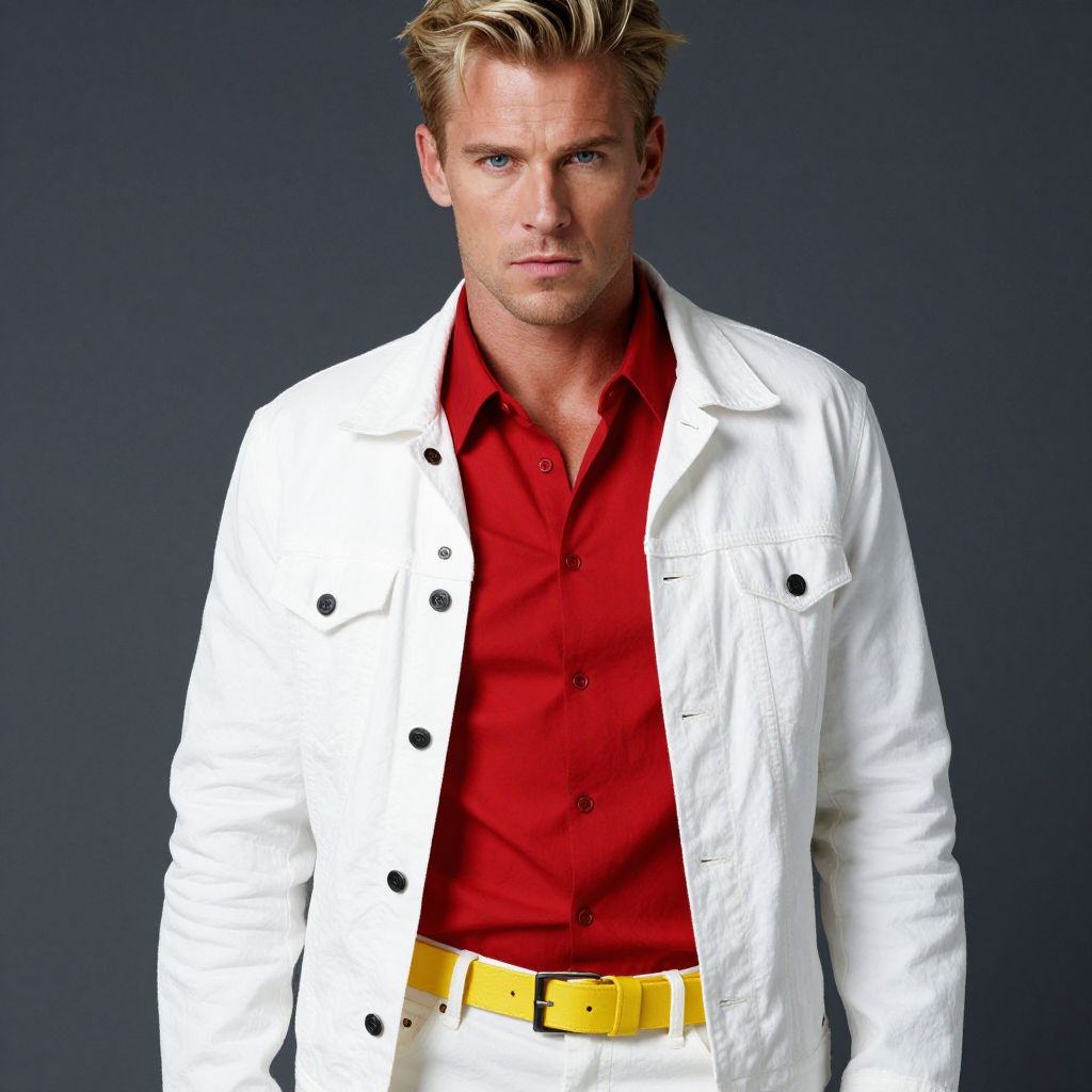 Photograph of a handsome, blonde, blue-eyed man with a serious expression. He's wearing a bright red button-up shirt under a crisp white jacket with black buttons. He has a yellow belt that stands out against his white pants. The background is a solid dark gray, making his vibrant outfit pop. His hair is slightly tousled, and he looks directly at the camera.