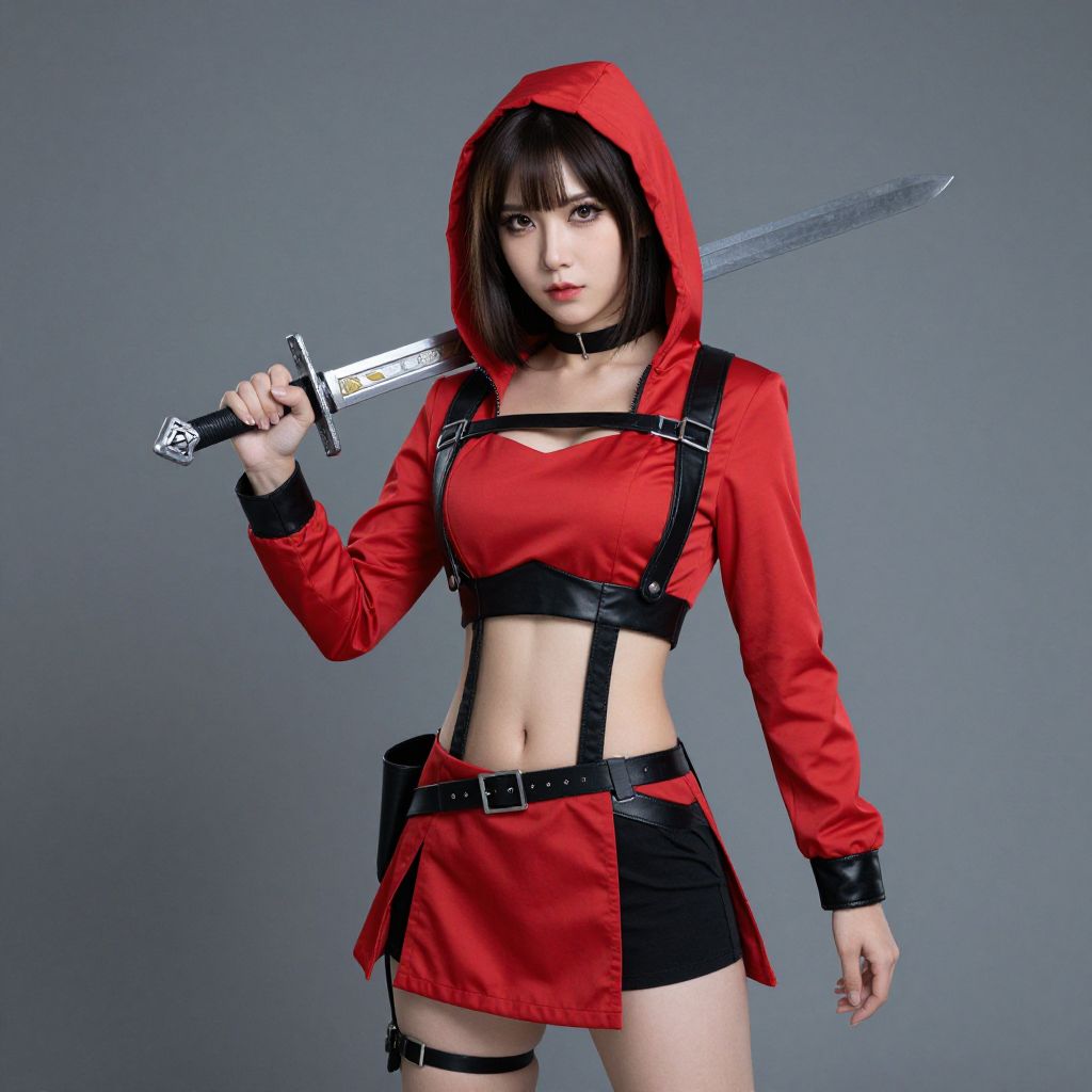 Secret Warrior Girl Costume, woman in a red and black outfit holding a sword