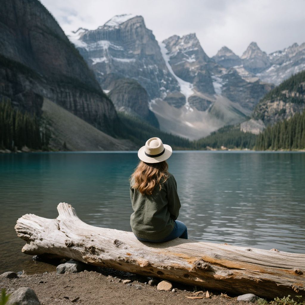 Photograph of a woman with long, brown hair, wearing a straw hat, olive green jacket, and blue jeans, sitting on a large, weathered log by a calm, blue lake. She faces snow-capped mountains with dark, forested slopes under a clear, bright blue sky. The log is in the foreground, with the lake and mountains extending into the background. The image captures a serene, natural setting, emphasizing the contrast between the woman's casual attire and the grandeur of the mountain landscape.