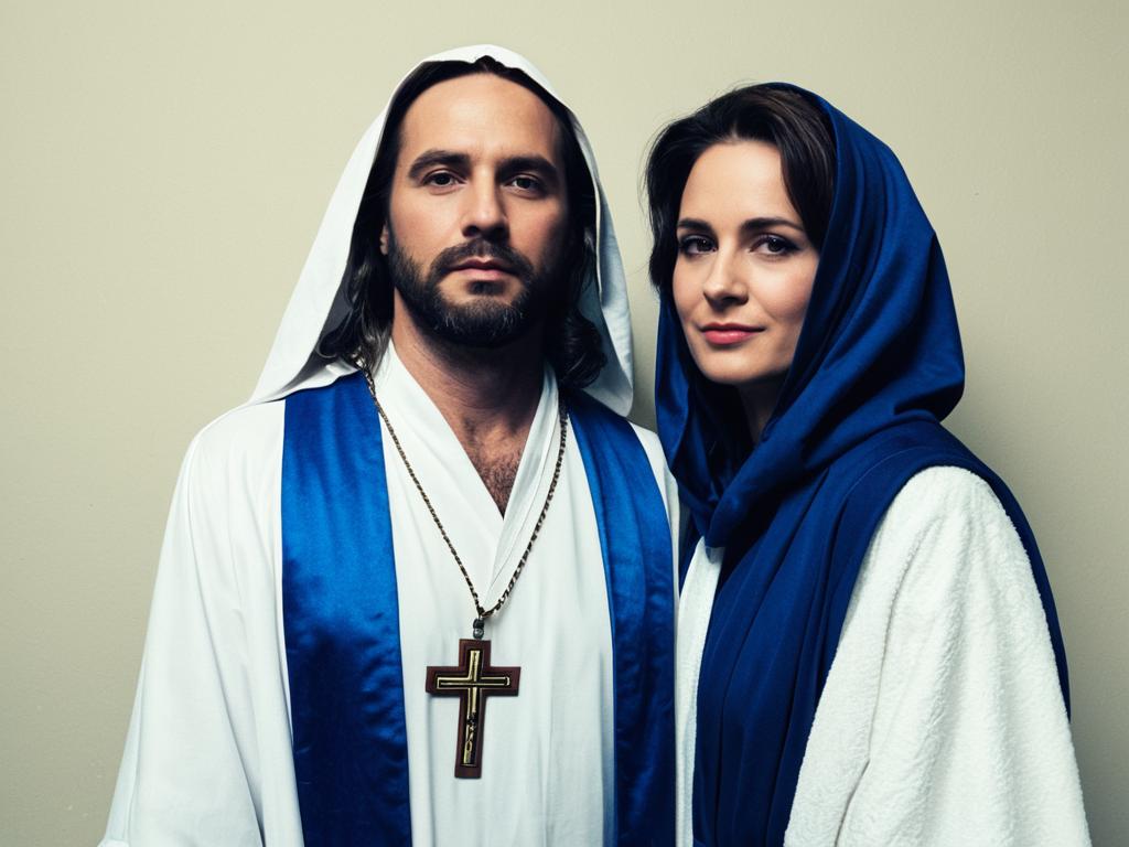 Saint Costume Adults face swap, man in a white and blue robe and a cross