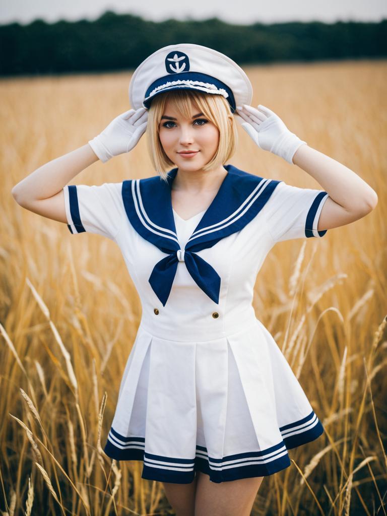 Photo-realistic cosplay photo of person standing in janus (kancolle) costume. 1girl, blue eyes, blonde hair, short hair, parted bangs, sailor hat, white gloves, sailor dress, white dress, white headwear, blue sailor collar, short sleevesfull body shot. lifestyle stock photo, shallow depth of field, lifestyle stock photography, shallow depth of field, natural lighting, warm tones, soft background blur, vibrant colors, realistic textures