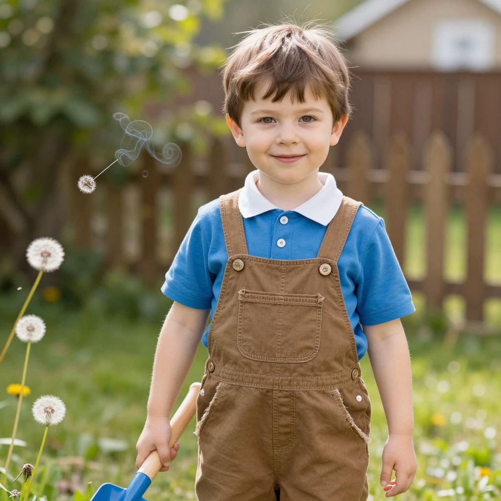 A young boy with short brown hair, bright eyes, and a warm smile, wearing a clean blue shirt with a white collar and brown overalls that have small pockets and frayed edges. He stands in a sunny backyard, holding a wooden toy shovel, with dandelions blowing in the breeze and a small wooden fence in the background. The scene is vibrant and slightly nostalgic, capturing a moment of simple childhood joy.