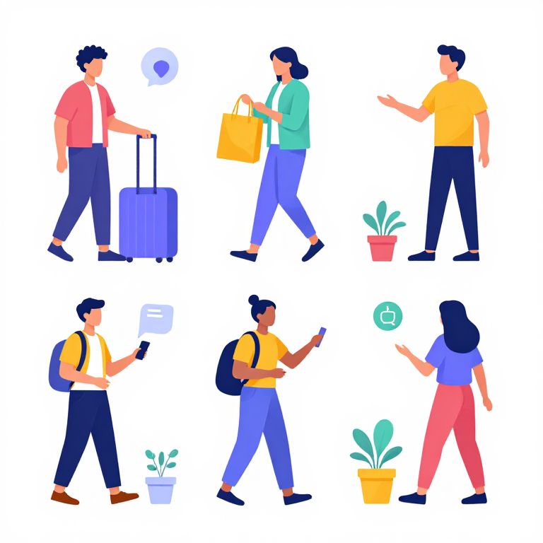 Digital illustration of six diverse travelers with luggage, backpacks, and plants, walking and interacting, in colorful, flat style.
