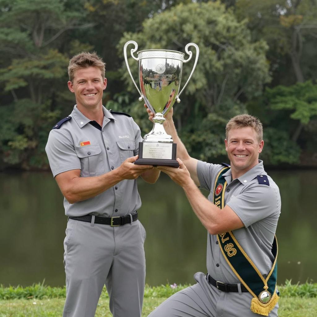 Two men in gray uniforms holding a large silver trophy with handles, smiling. Background: lush green forest and a lake. Man on left stands, man on right kneels, trophy raised high. Both have short brown hair. Trophies has inscription. Man on right has decorative sash. Daylight, natural setting.