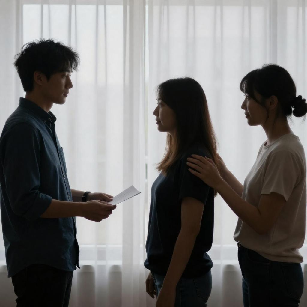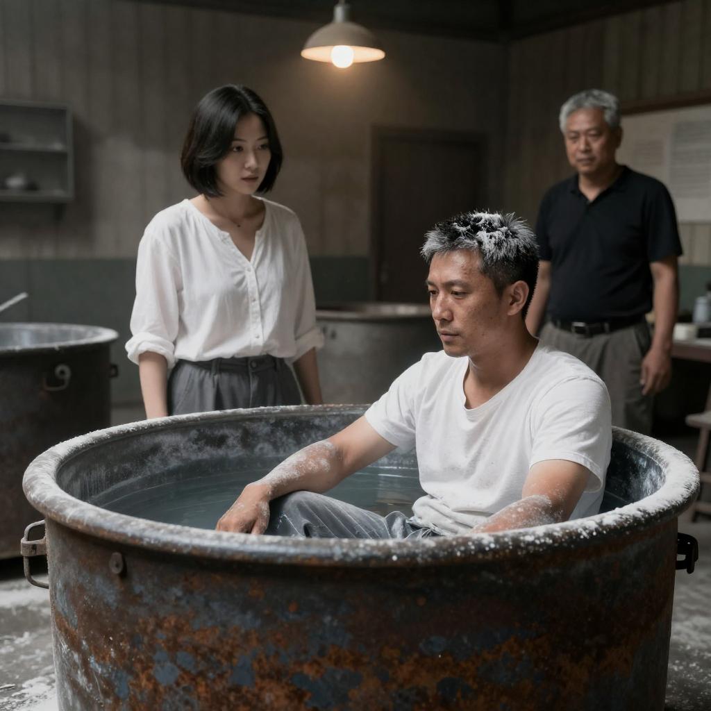 Photograph of three people in orange prison uniforms in a dimly lit, tiled room. Two women, one with dark hair and glasses, are restraining a gray-haired man in a white shirt against a wall. The man's shirt is dirty, and the women are smiling. The background includes a window with bright light.
