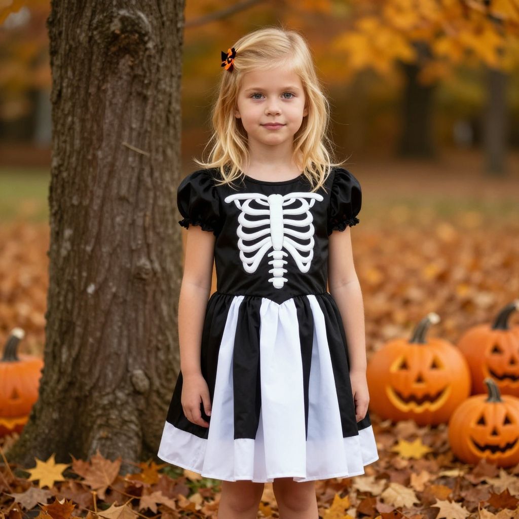 A young girl with blonde hair stands outdoors near a tree in autumn. She wears a black and white Halloween dress with puffy short sleeves and a skeleton design on the chest. The scene includes fallen leaves and Halloween pumpkins in the background, reflecting a festive, spooky atmosphere.
