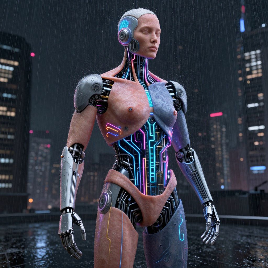 CGI image of a bald, humanoid robot with glowing neon circuitry, exposed breasts, and pink underlayer, standing in a rainy, futuristic city