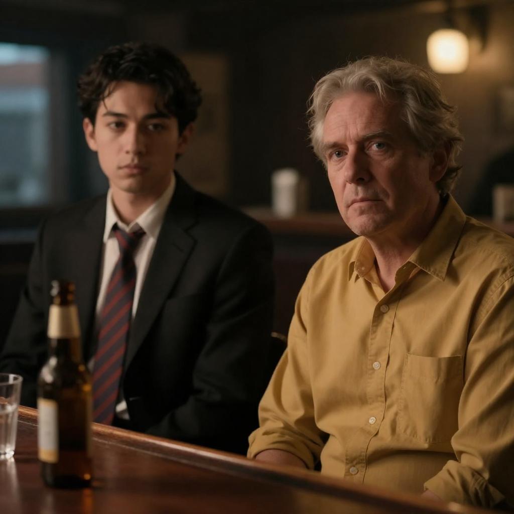 Photograph of a dimly lit, vintage library room with three men. Foreground: a man in a gray suit, white shirt, and black tie, sitting on a brown leather tufted sofa, holding a glass. Background: two older men in suits, one standing and one seated, near bookshelves. Warm lamp light illuminates the scene, casting soft shadows. Glass coffee table with a box and glassware in front.