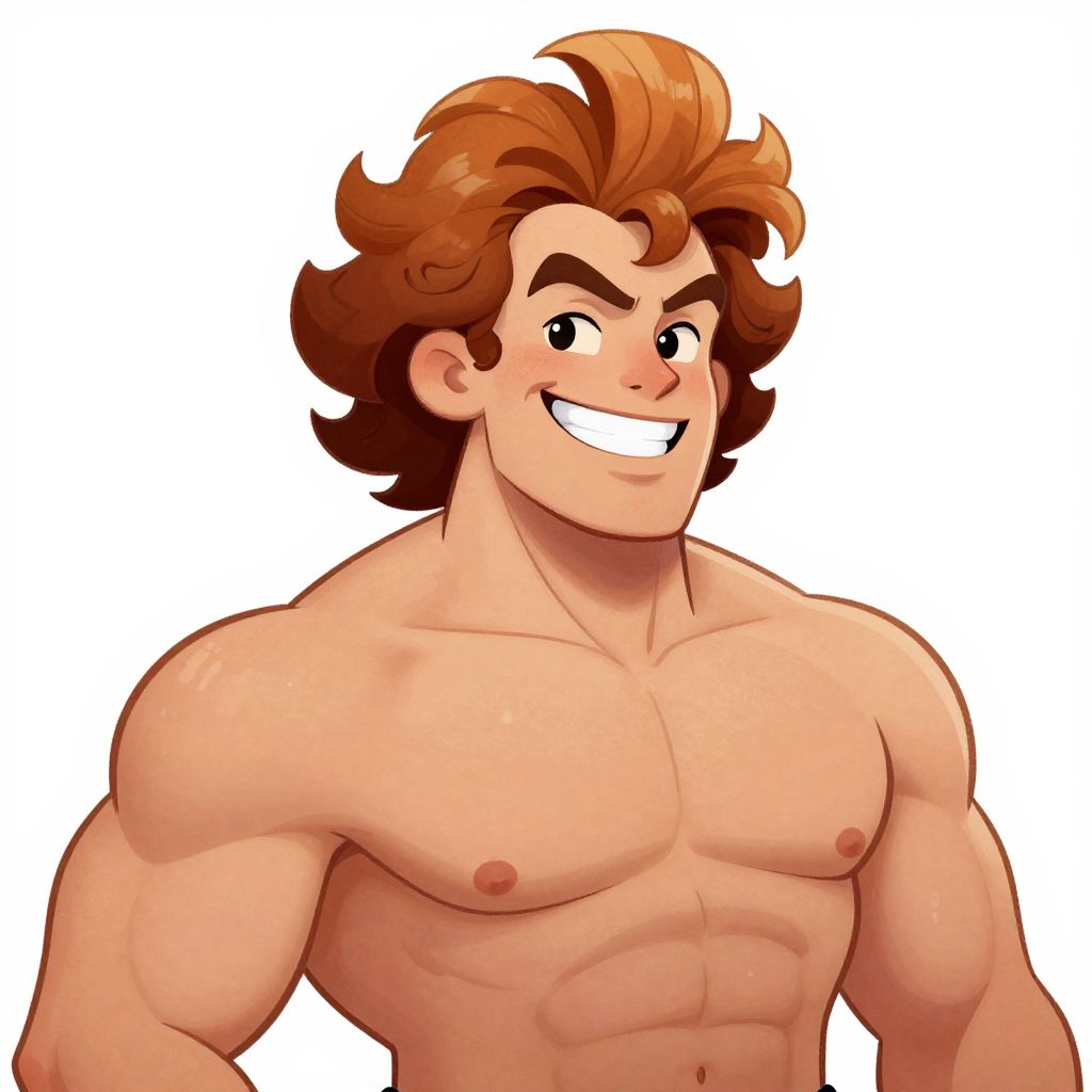 This vibrant and playful illustration features a muscular man with bold, curly ginger hair and a confident smile. The character showcases a whimsical, cartoonish style with exaggerated features, emphasizing strength and character.