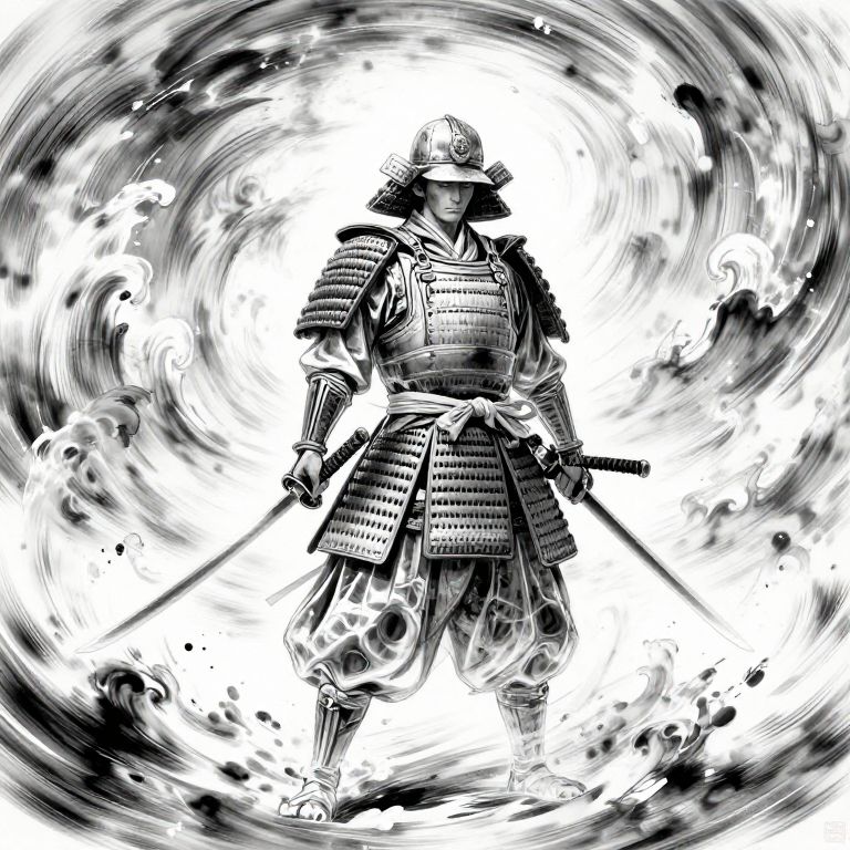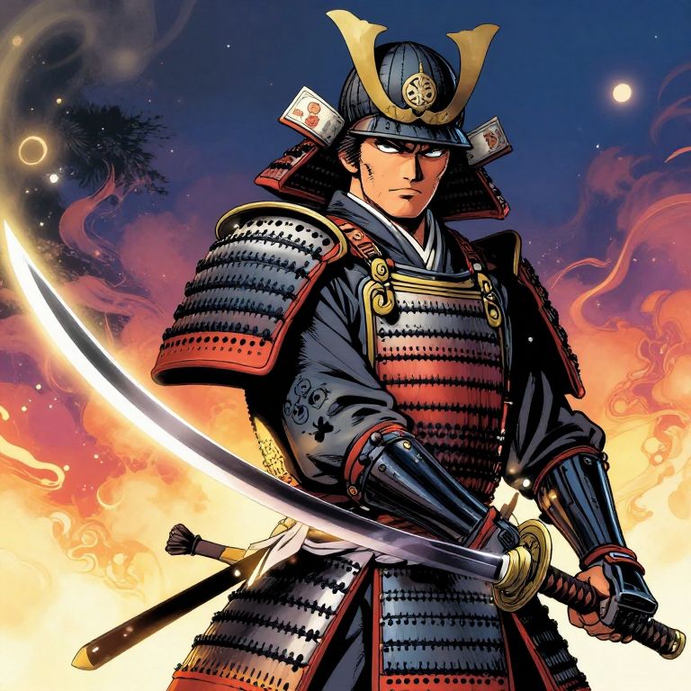 Throwback Comic style detailed samuari, realistic armour, vibrant colours with mystical light. holding katana,