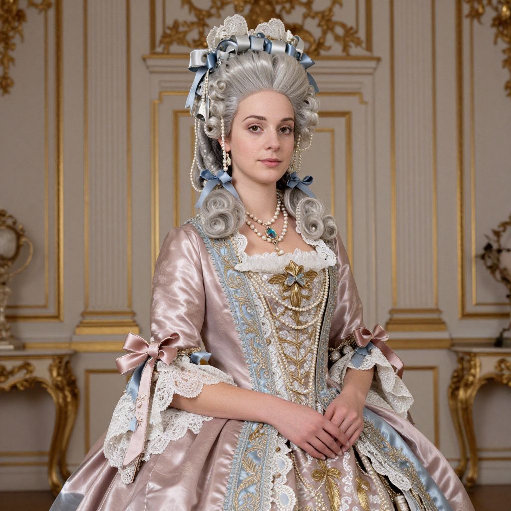 A woman dressed in an elaborate Marie Antoinette style fancy dress from the 18th century features soft pink and blue satin fabric with ornate lace and pearl detailing. Her voluminous powdered wig adorned with ribbons and pearls complements the opulent setting, evoking the luxury of Rococo-era French court fashion.