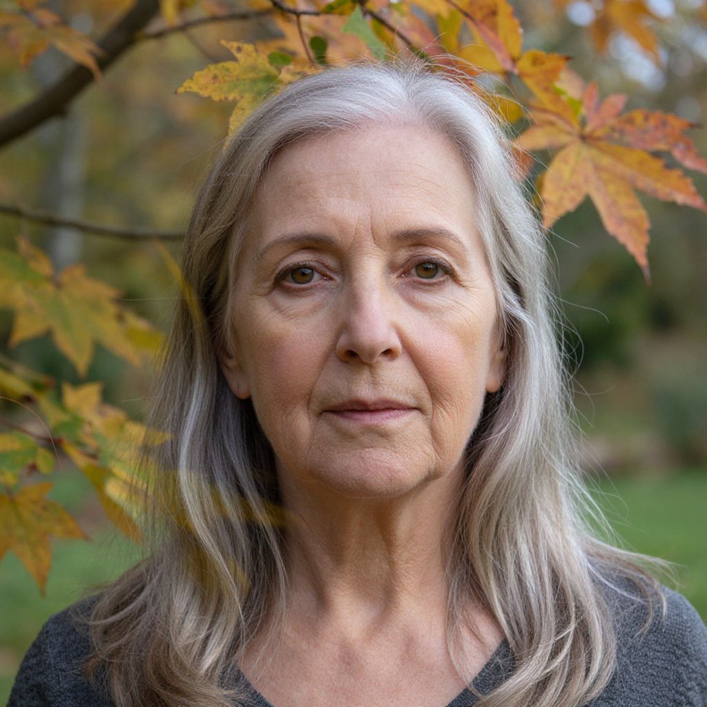 Photograph of an elderly woman with silver hair, fair skin, and gentle expression, standing against a background of autumn leaves.