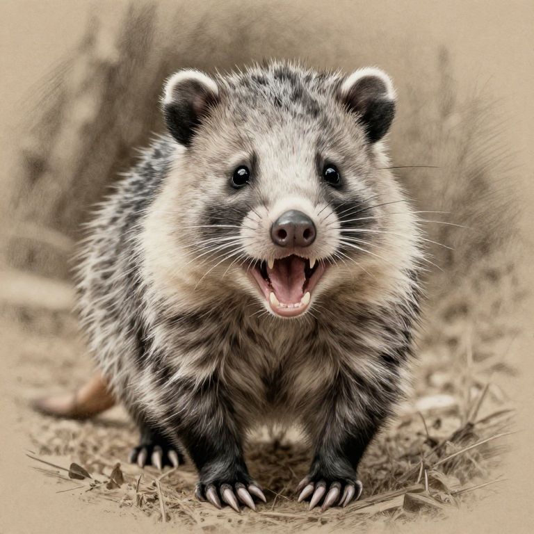 Realistic possum drawing, open-mouthed possum standing on hind legs showing detailed teeth and claws, neutral forest background blurred, sharp focus on facial features and fur, warm earth tone palette, highly detailed pencil sketch with subtle digital enhancement