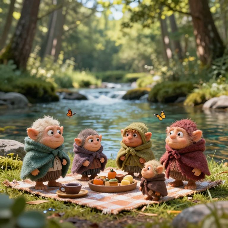Charming orcbuzog2he family having a picnic by a crystal-clear river, miniature orcs with big round heads and wide innocent eyes, wrapped in cozy cloaks, playful scene with butterflies and dappled sunlight filtering through tall trees.