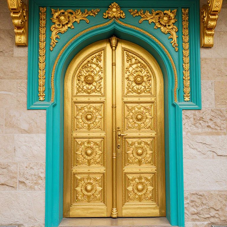 Imposing golden double doors intricately adorned with floral and geometric patterns stand majestically within an arched teal frame, flanked by ornate gold embellishments and set against a backdrop of textured stone walls.