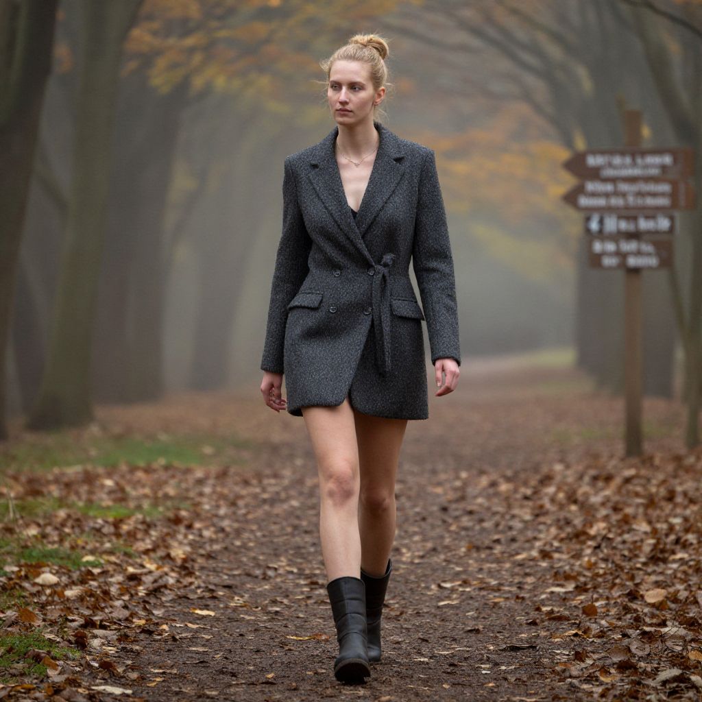 Photograph of a confident blonde woman in a dark grey blazer and black boots, walking on a foggy, leaf-covered forest path with directional signs