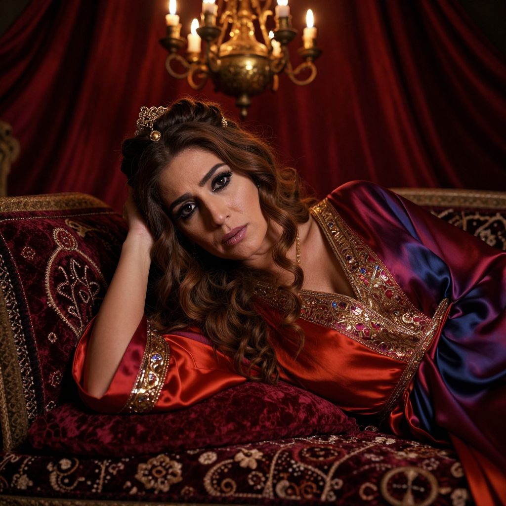 Superrealistic detail captures the enigmatic allure of a Middle Eastern woman with piercing dark eyes and wavy chestnut hair, styled in an intricate updo adorned with gold jewelry. The warm glow of candlelight from an ornate brass chandelier above casts gentle shadows that soften her features, revealing subtle wrinkles around her mouth, hinting at a life filled with both laughter and sorrow. From a low angle, her gaze pierces through the viewer as she reclines upon a richly embroidered velvet divan. The vibrant silk kaftan she wears contrasts starkly with the deep red hues of the luxurious fabric beneath her, creating an emotional gradient that resonates with mystery, sensuality, and a sense of ancient wisdom.