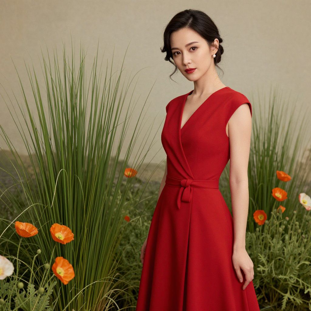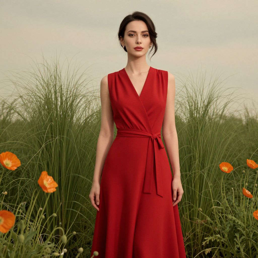 Elegant woman in a vibrant red dress stands gracefully amidst tall green foliage and blooming orange poppies, exuding timeless sophistication against a soft, vintage backdrop.
