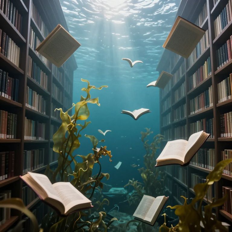 An endless library dissolves into a tranquil underwater realm, where books float serenely like kelp, their pages unfurling as if alive, defying gravity in a dreamlike aquatic expanse.