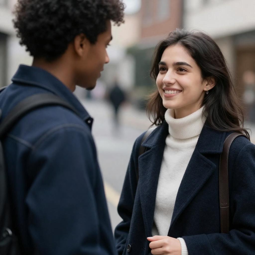 Photograph of two women in winter clothes. Blonde woman in gray beanie, gray coat, and black gloves points at red scarf-wearing woman with brown coat. Background: Christmas trees, blurred people. Blonde woman smiles, red scarf woman looks curious.