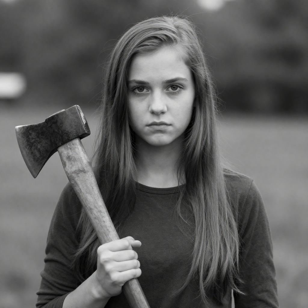 Black-and-white photograph of a young woman with long, straight hair, holding an axe. She has a serious expression, wearing a dark shirt. Background is blurred with indistinct shapes. She is centered, axe in her right hand.