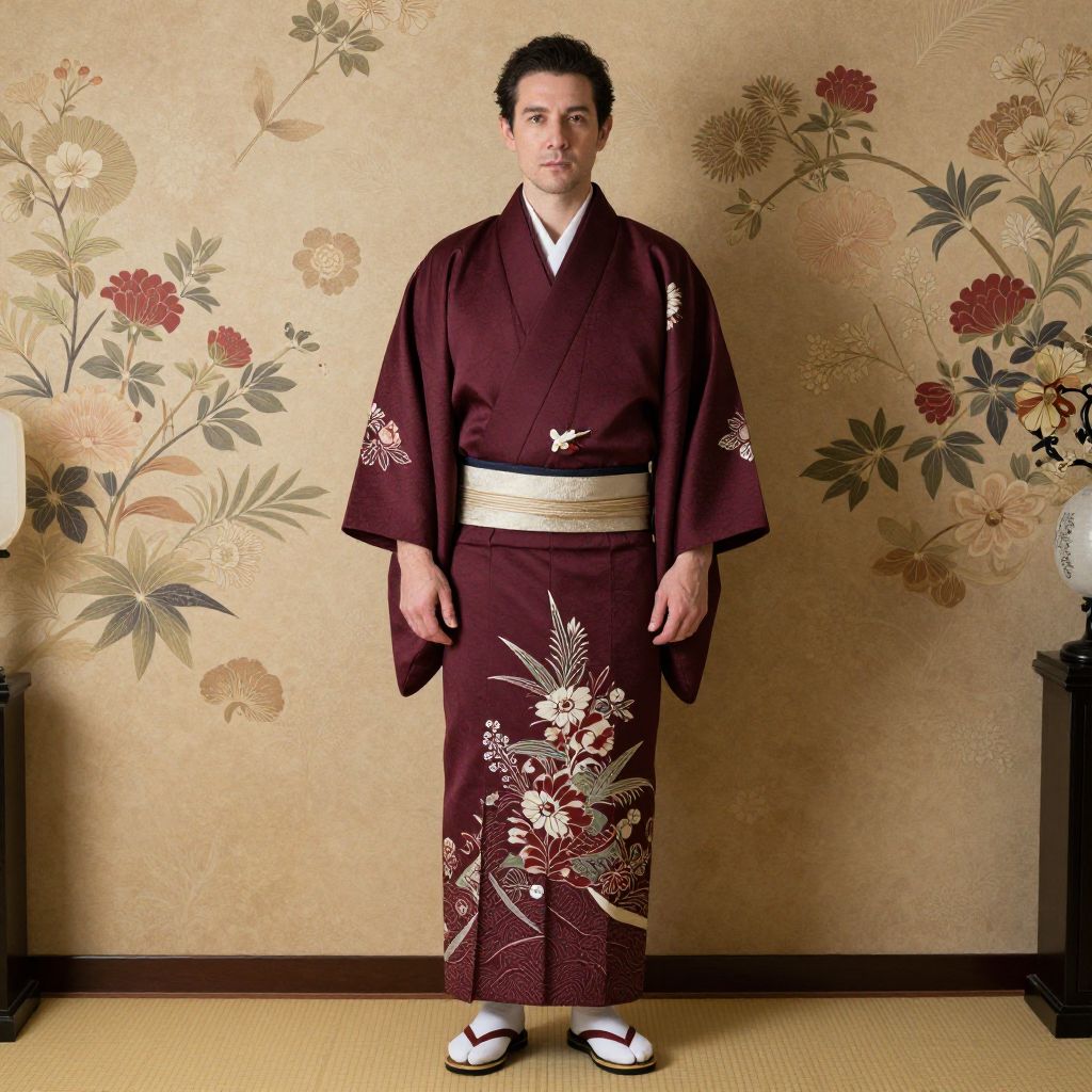 A stylish man dressed in a traditional kimono stands confidently against a floral patterned wall, embodying a blend of modern and classic aesthetics. The rich burgundy tones of the kimono, adorned with intricate floral designs, create a striking contrast with the elegant decor of the room.