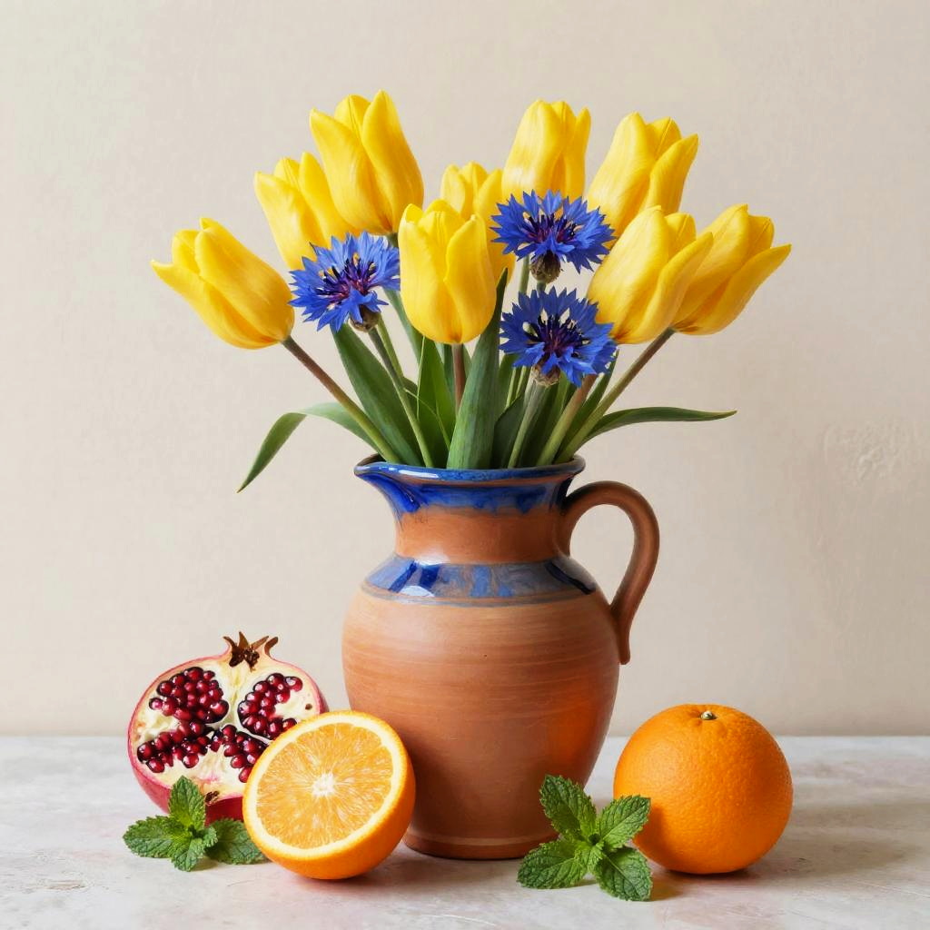 A still life painting of a hand-thrown terracotta jug with blue glaze rim brimming with yellow tulips, blue cornflowers, and sprigs of mint. In front rest a sliced orange with seeds, a halved pomegranate, and a whole orange on a clean surface; the light cream plastered wall keeps focus on form and color. Warm, balanced composition, soft natural light, gentle shadows, crisp edges, high detail, tasteful negative space, editorial quality, SDXL ready.
