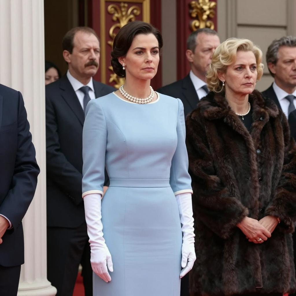 Group of people in formal attire. Center: woman with dark hair in white dress with ruffles, white gloves, necklace, medium breasts, serious expression. Left: man with mustache, black suit, white shirt, black bow tie, looking down. Right: woman with blonde hair, black coat, intense expression. Background: ornate pillars, people. Foreground: large, detailed stone urn. 5 people.