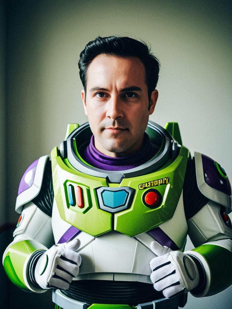 Man in Buzz Lightyear costume, cosplay editorial photography, realistic tones