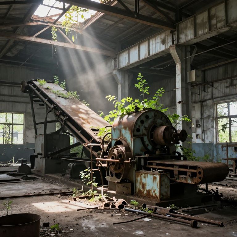 Abandoned factory interior, rusty machinery and conveyor belts overtaken by nature, beams of light piercing dusty air, scattered tools and debris on concrete floor, post-apocalyptic feel with contrast between metal decay and creeping plants, hyper-realistic textures