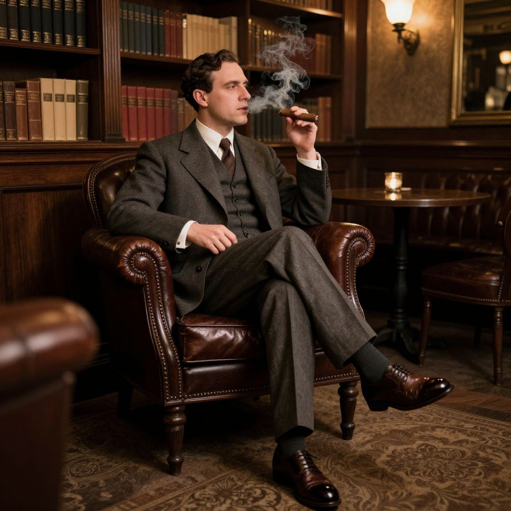 1920s businessman sitting in a luxurious vintage lounge smoking a cigar, dressed in a tailored suit and polished shoes, leather chairs and dark wood shelves filled with books, soft warm lighting, atmosphere of wealth and power with intricate period details