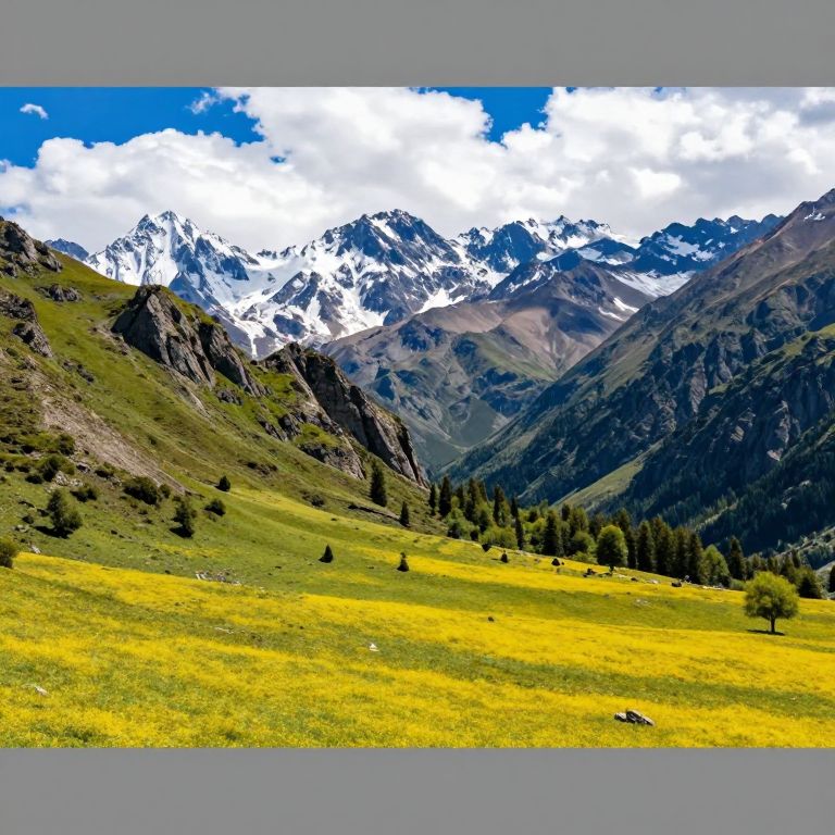 Photograph of a vibrant yellow meadow with scattered trees, leading to a mountain range with snow-capped peaks under a bright blue sky with white clouds