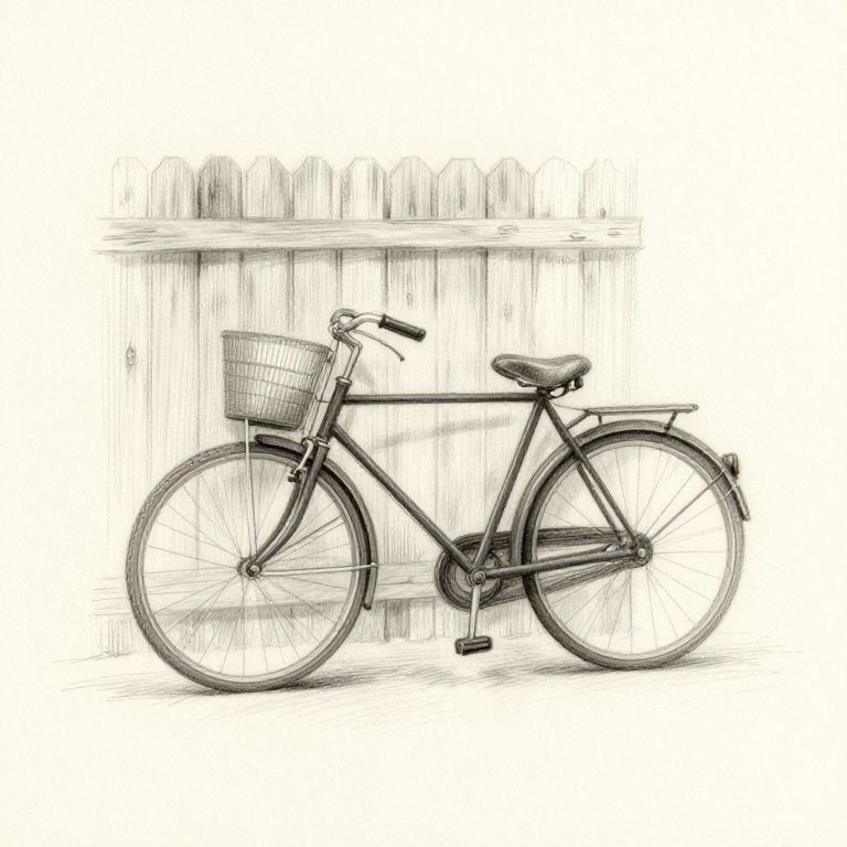 Simple sketch art of a vintage bicycle leaning against a rustic wooden fence, loose and fluid pencil strokes, textured paper background, subtle highlights and shadows creating depth, nostalgic and peaceful urban charm