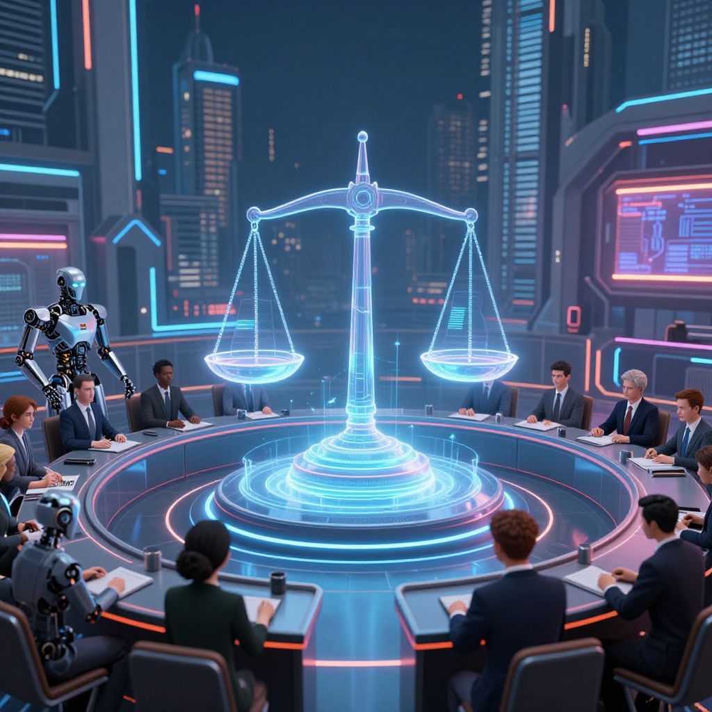 Neon-lit futuristic courtroom scene with balanced scales hologram, eight suited men seated, one in black bodysuit, cityscape backdrop.