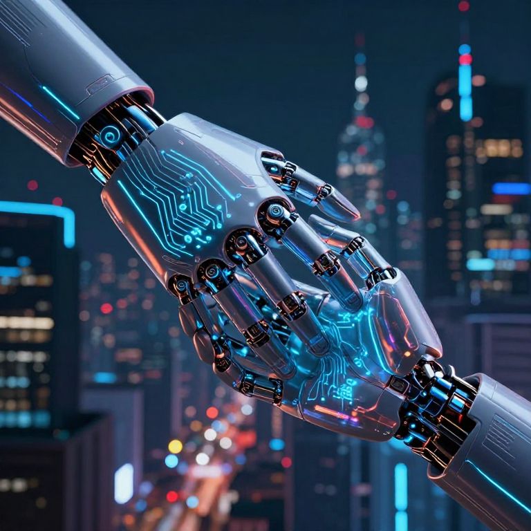 Photorealistic digital artwork depicting a futuristic robotic hand with glowing blue circuitry extending from the left, reaching towards a similarly designed robotic hand on the right. The background showcases a vibrant, nighttime cityscape with illuminated skyscrapers, colorful neon lights, and blurred lights from a busy street below. The robotic hands have metallic textures with intricate, glowing blue lines resembling electronic pathways. The scene exudes a high-tech, cyberpunk aesthetic, highlighting advanced technology and connectivity.