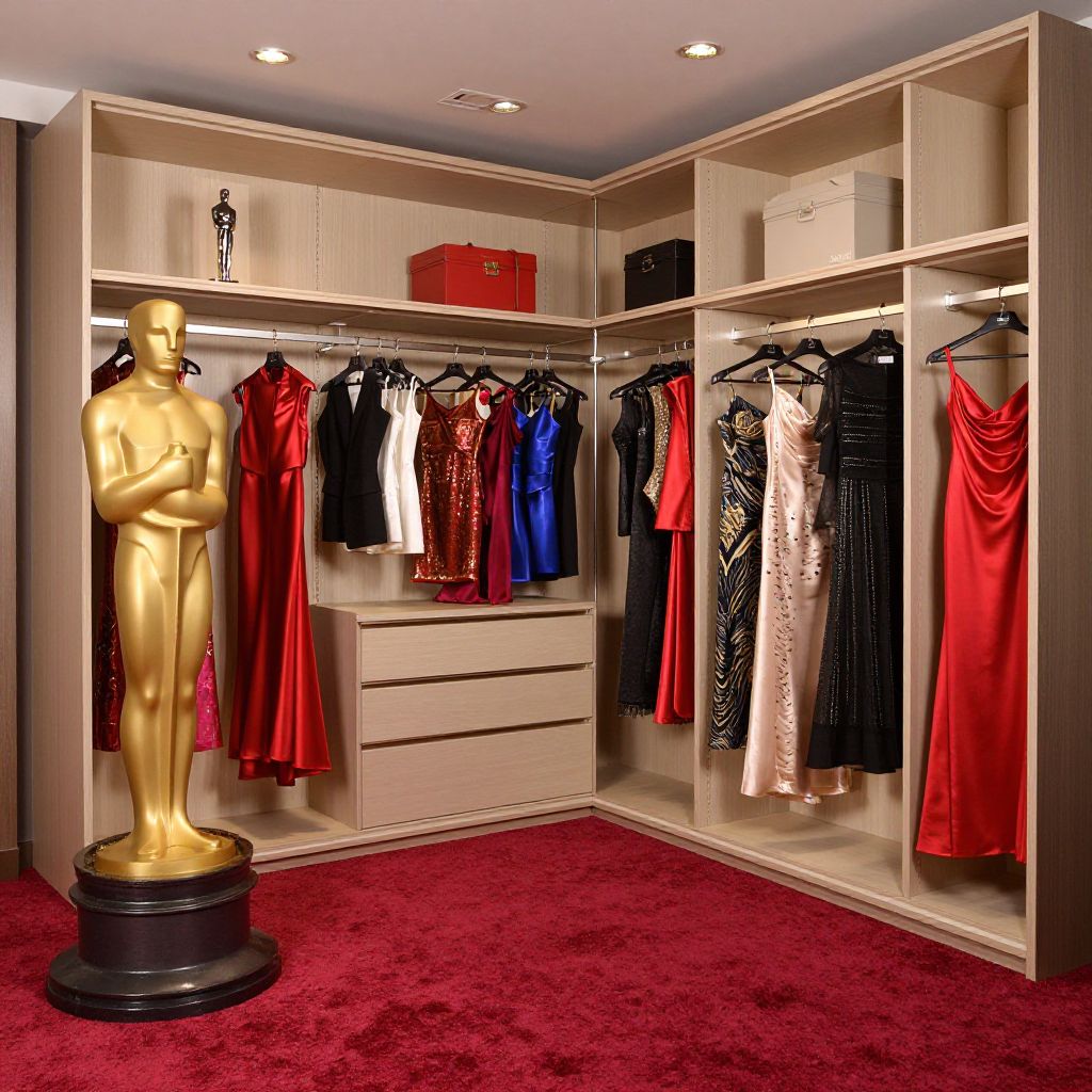 Photograph of an elegant walk-in closet with beige wooden shelves and a red carpet. The shelves house an assortment of glamorous evening gowns in red, blue, black, and white, with some having sequins or satin textures. A gold Oscar statuette stands on a black base to the left, adding a touch of prestige. Above, a red box and a black box are neatly placed on the top shelves. Recessed ceiling lights illuminate the space, highlighting the clothing and statuette. The closet exudes a luxurious and sophisticated atmosphere.