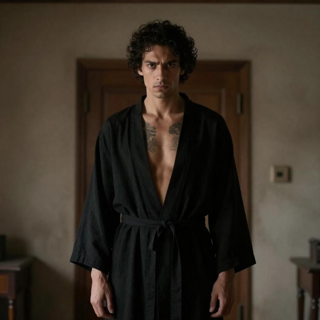 Man with short, curly dark hair, light stubble, wearing a gold and red striped robe, standing indoors, looking slightly to the right, serious expression. Background: blue wall, framed black and white photos, circular wall decoration.