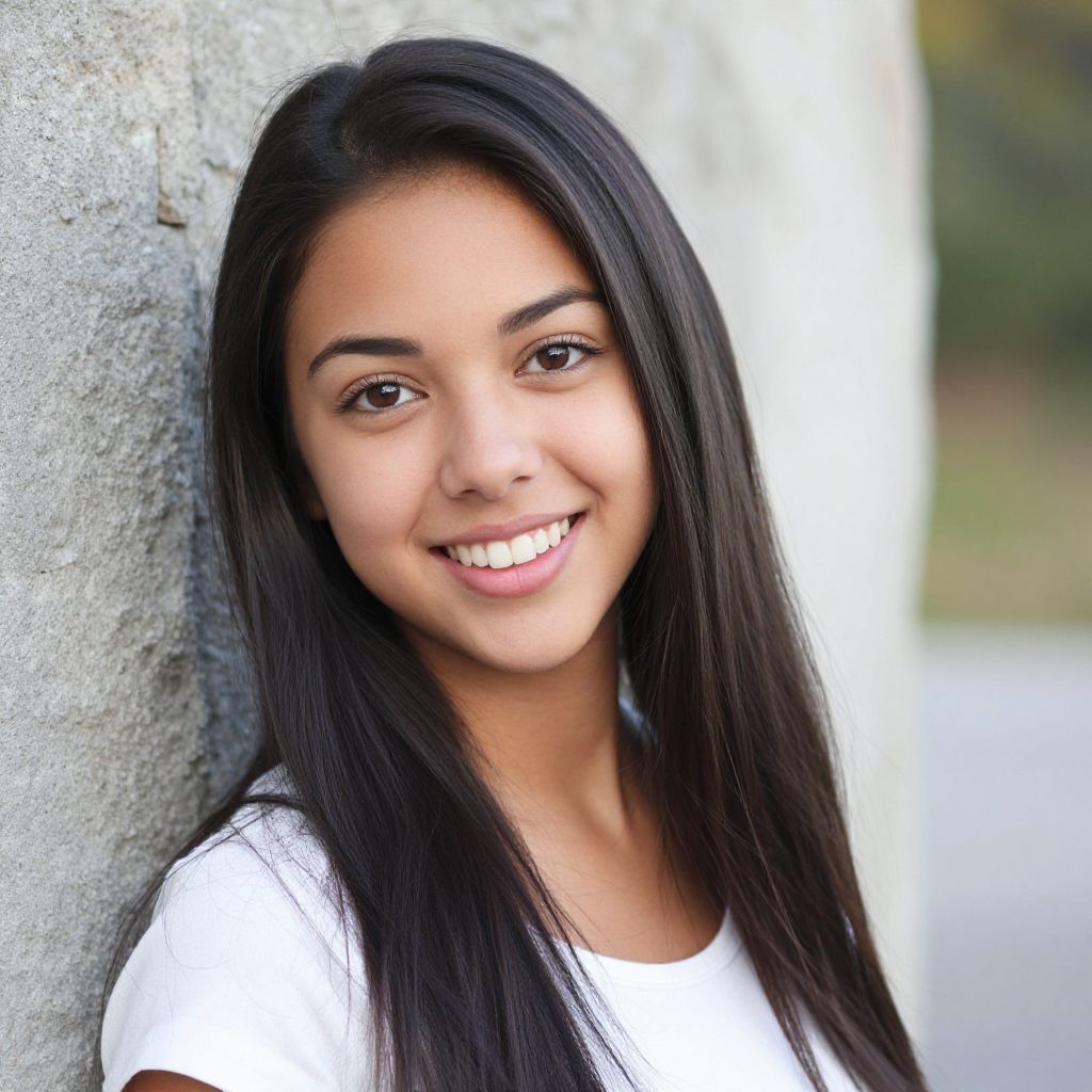 Photograph of a young woman with long, straight black hair, brown eyes, and a warm smile, wearing a white shirt, leaning against a textured