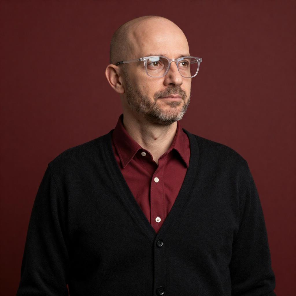 Photograph of two bald men in dark suits standing in a modern, sunlit room with large windows. The man on the left wears a red tie and smiles, while the man on the right wears a blue shirt and stands with his hands in his pockets. They stand in front of a glass railing with wooden floors beneath.