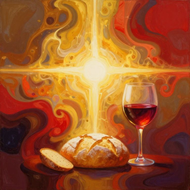 This digital painting showcases a vibrant, abstract style. At its center is a glowing, radiant cross, emitting bright yellow and white light. In the foreground, a crusty, white bread loaf with a large, round slice cut out rests on a dark red, reflective surface. To the right of the bread, a clear wine glass filled with deep red wine sits. The background features swirling, fluid patterns in rich reds, oranges, and browns, creating a dynamic, almost fiery atmosphere. The light from the cross illuminates the bread and wine, adding a sense of warmth and intensity to the composition.