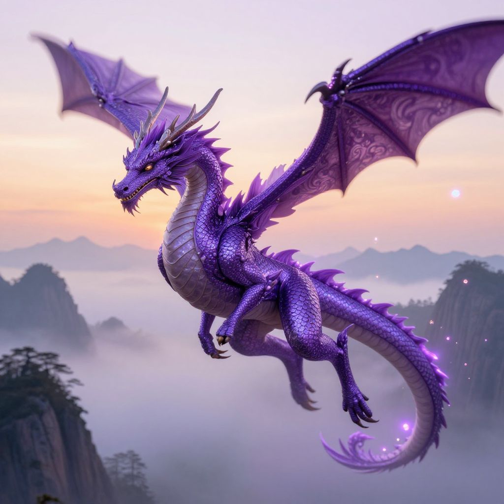 Digital artwork of a vibrant purple dragon with intricate scales, wings extended, soaring above misty mountains at sunrise.